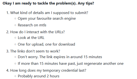 It looked like the first step was to submit some details via the first link, which pointed to https://61lxjmt991.execute-api.ap-southeast-1.amazonaws.com/development/generate. Upon clicking on it, the browser showed 2 different URLs: