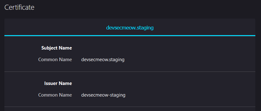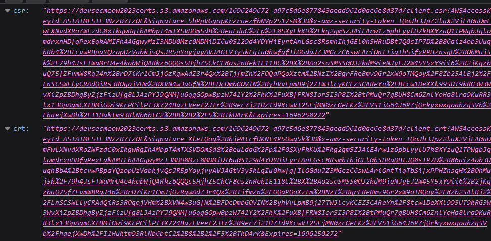 $ curl "https://devsecmeow2023certs.s3.amazonaws.com/1696250041-0b5bce67dd5341e897207f159bd3c37e/client.crt?AWSAccessKeyId=ASIATMLSTF3NZZB7IZOL&Signature=xtLlCxg4yANf6a0pO2QqAHocZXk%3D&x-amz-security-token=IQoJb3JpZ2luX2VjEA0aDmFwLXNvdXRoZWFzdC0xIkgwRgIhAMbpT4mTXSVDOmSd8%2BeuLdaG%2Fp%2F0SXyFkKU%2Fkg2qmSZJAiEArw1z6pbLyylU7k8XYzuQ1TPWgbJqlomdrxnHDfqPexEqkAMIFhAAGgwyMzI3MDU0Mzc0MDMiDI6u0S129d4YDYHiEyrtAnLGsc8RsmhIhjGEl0hSHRuDBtJQ0sIP7D%2B86aiz4ob3UuqhBb4%2BtcvwPBpaYQzopUzVabkjvQsJR5pYoyjvyAVJAGtV3y5kLqIu0hwfgfIlOGduJZ3MGczC6swLAriOntTiqTbSifxPPHZnsqH%2BOhMuj5k%2F79h4JsFTWaMrU4e4kobWjQARkz6QQQs5HjhZ5CkCF8os2nRek1E118C%2BX%2BAo2soSMSS0OJ2kdM9ieNJyEJ2W45Y5xY9ii6%2B2jKqzbuQ75fZFvmW8RqJ4n%2BrD7iKr1CmJjOzRgwAdZ3r4Qx%2BTjfmZn%2FOQaPQoXztm%2BNzI%2BgrFReBmv9Gr2xW9oTMQoy%2F8Zb25AlBj2%2FLnSCSWLlyCRAdQiRs3ROqojVHm%2BXVN4w3uGfN%2BFDcDmbGOVIN%2ByhVvLpmB9j27TWJlcyKCEZ5CAReYn%2F8tcw1DeXXl995UT9kRG3W3WvXiZpZBDhgByZjzFizUfg8LJAzPYJ9QMMfu6qgGOpwBpzW741Y2%2FkK%2FuXBfFRN8IorSI3P8I%2BtPMuQr7gBUH8Cm6ZnlYoHa8lra9KuRR3lx13OpAqmCXtBMiGwi9KcPCilPT3X724BuzLVeet2Jtr%2B9ec7j21HZTd9KcwVT2SLjMN0zcGeFKz%2FV51iG64J6PZjQrkyxwxgoahZq5Vb%2FhaejXwDh%2FI1Huktm93RlNb6btC2%2B8%2B2%2F5%2BTkDArK&Expires=1696250641" -o client.crt